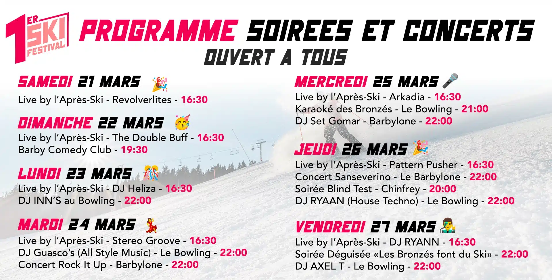 Du samedi 21 au vendredi 28 mars 2026, de nombreuses soirées et concerts sont organisés à l’occasion du 1er Ski Festival. Ces événements sont également ouverts à tous. Découvrez ci-dessous le programme détaillé des soirées et concerts jour par jour.